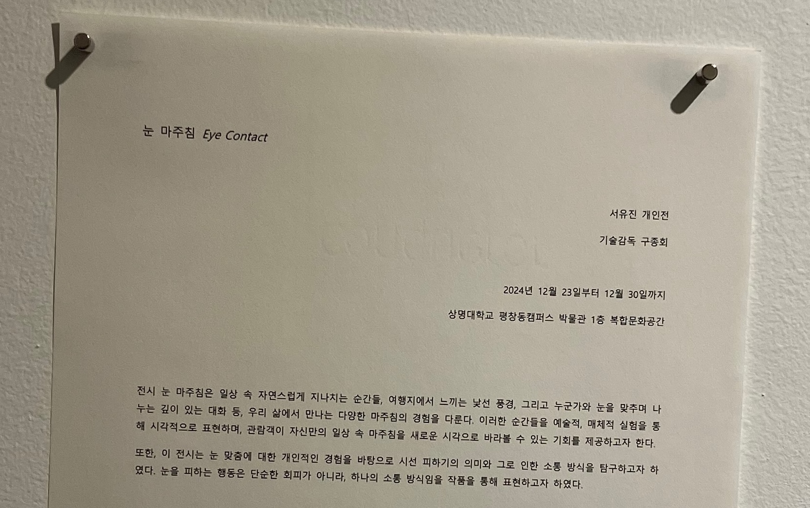 전시 눈 마주침은 일상 속 자연스럽게 지나치는 순간들, 여행지에서 느끼는 낯선 풍경, 그리고 누군가와 눈을 맞추며 나누는 깊이 있는 대화 등, 우리 삶에서 만나는 다양한 마주침의 경험을 다룬다. 이러한 순간들을 예술적, 매체적 실험을 통해 시각적으로 표현하며, 관람객이 자신만의 일상 속 마주침을 새로운 시각으로 바라볼 수 있는 기회을 제공하고자 한다.